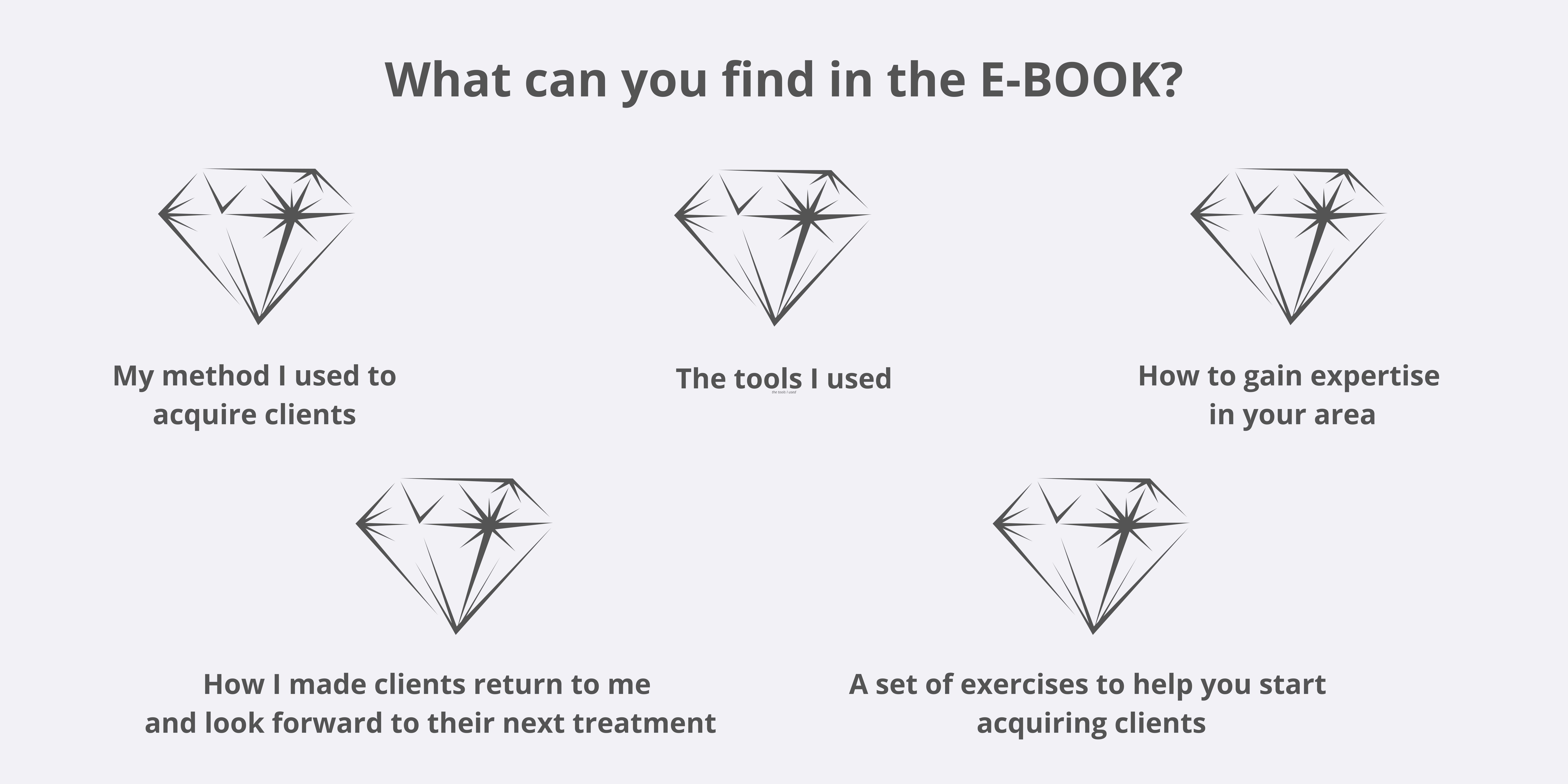 You'll get access to the e-book, where I will show you step-by-step how I filled my schedule with satisfied clients, built my reputation as an expert, and got my clients to give me free advertising and recommend me to others.